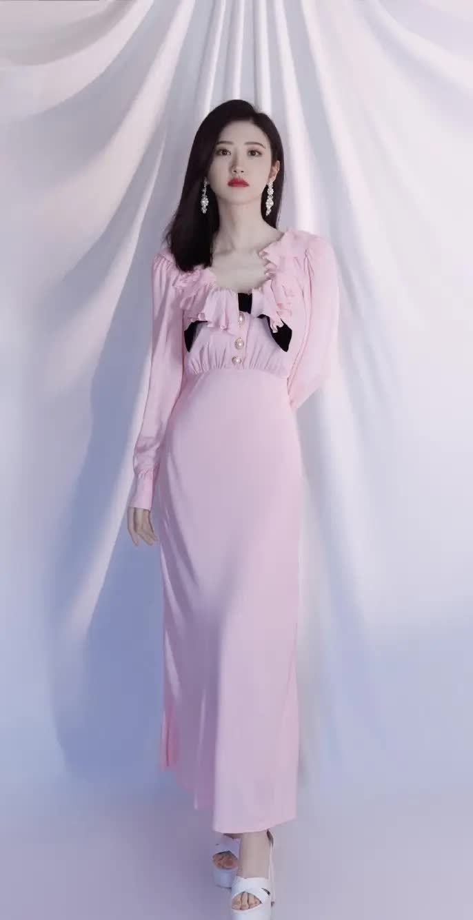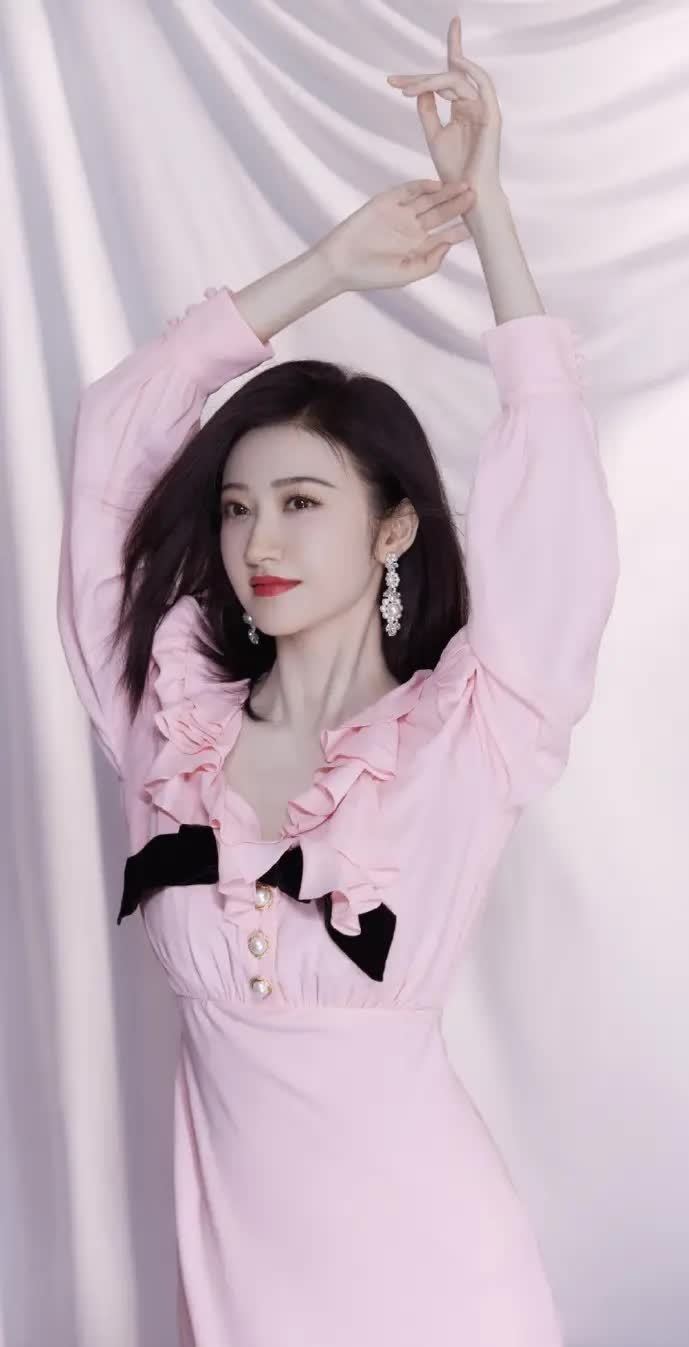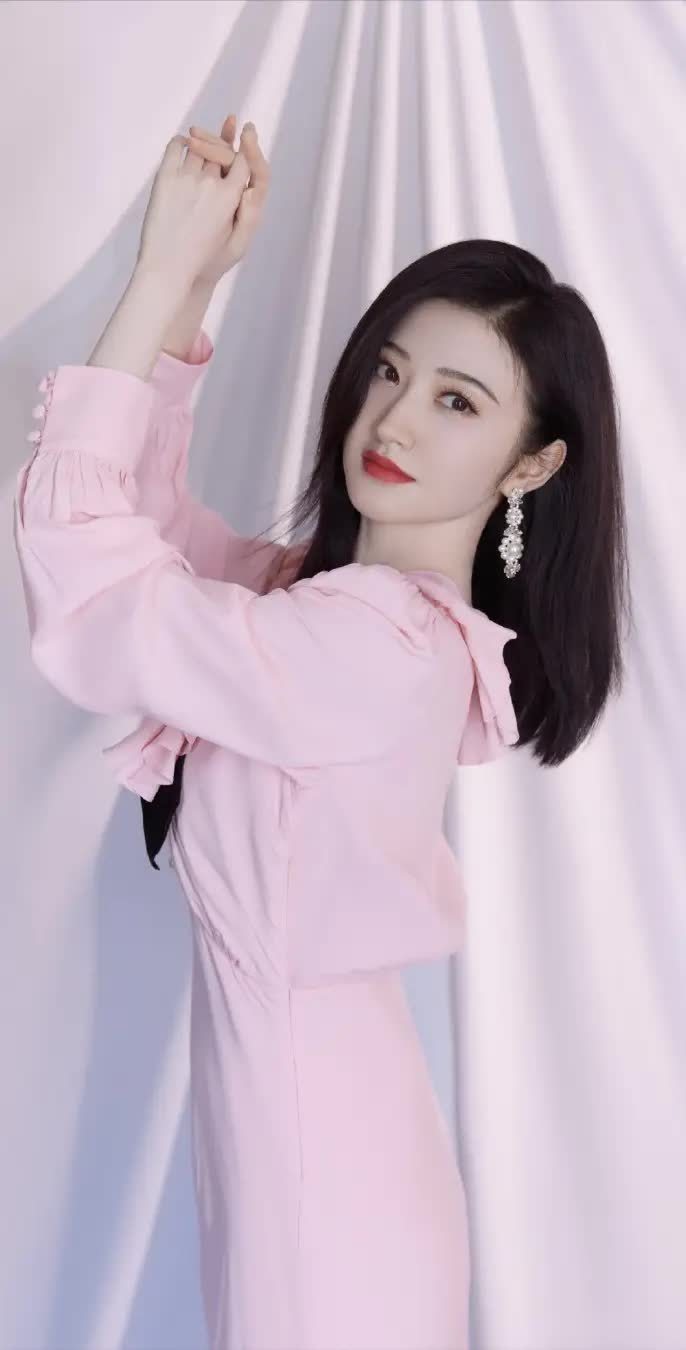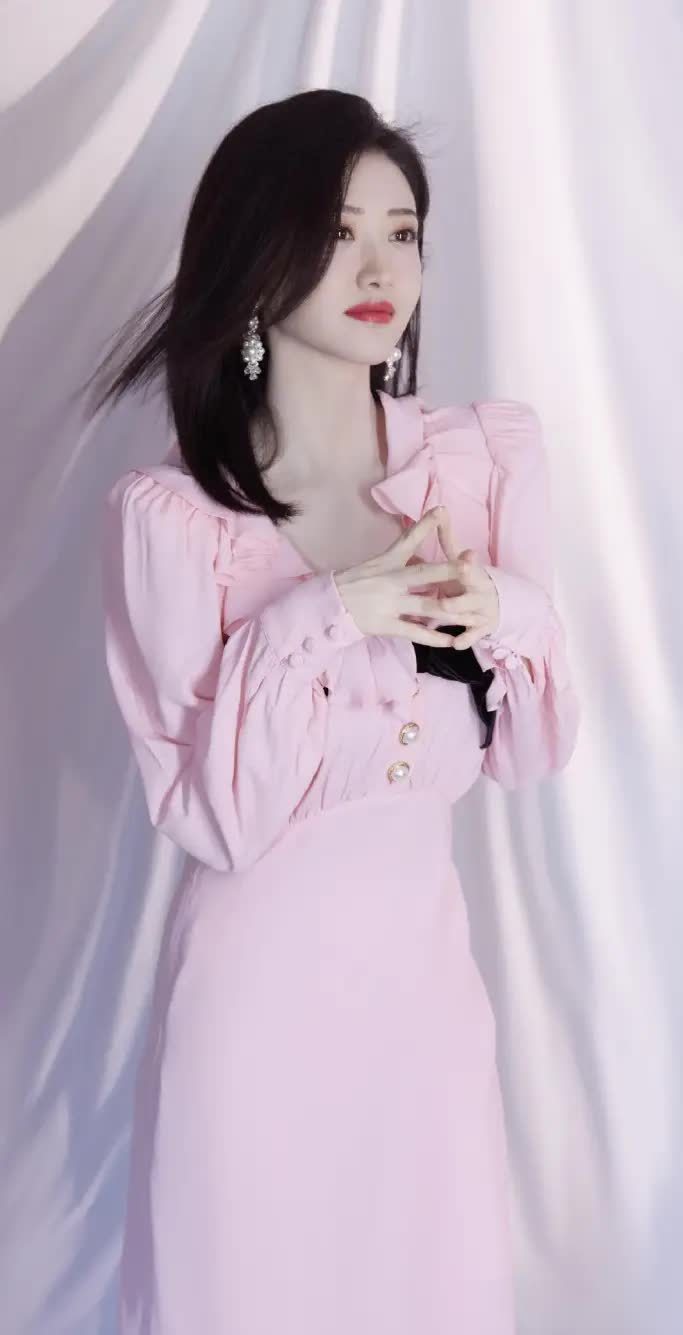 粉色常被标签化为“少女”、“甜美”的象征,但在景甜身上,它却呈现出一种温婉之中带着坚定感的美。她选择的是介于裸粉与藕荷之间的粉色裙装,低饱和度让整体更显优雅知性,不会给人“装嫩”或“轻浮”的感觉。