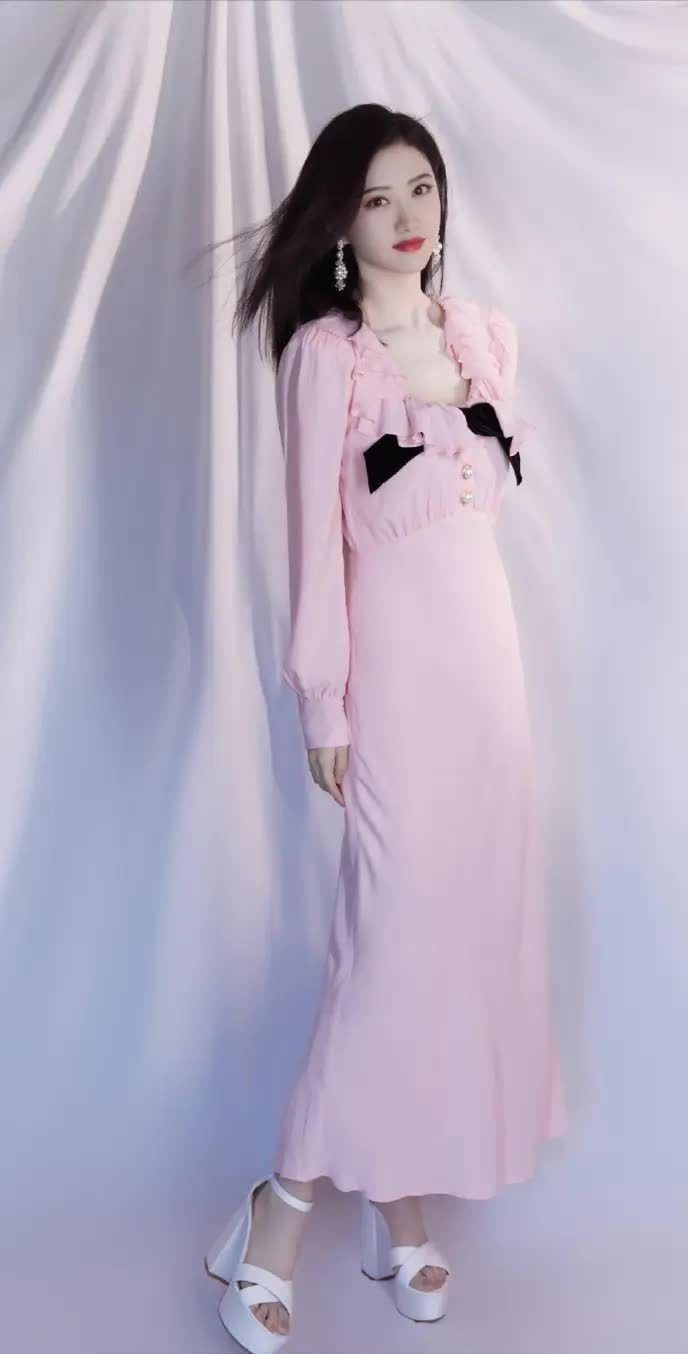 景甜的穿搭从不流于表面可爱,她善于用小面积的“反差设计”来增强记忆点。这身裙装胸前点缀的黑色蝴蝶结就是亮点:它像是一种“可爱元素的冷感处理”,使整身粉嫩不至于腻味。
